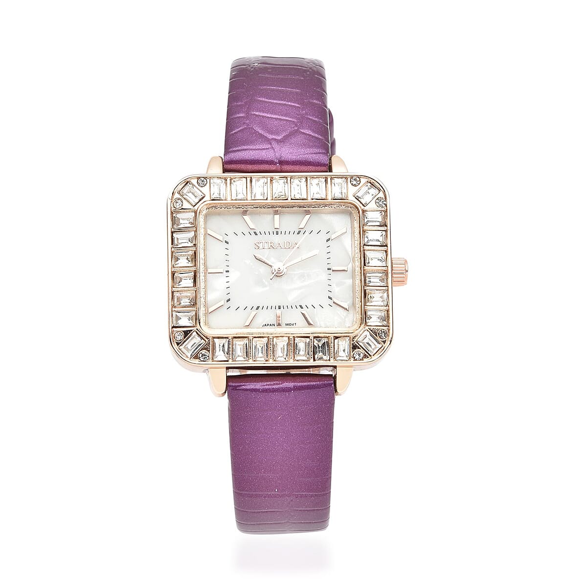 Strada Austrian Crystal Japanese Movement Square Shaped Dial Watch with Purple Faux Leather Strap (30mm) (7.0-8.0 Inch)