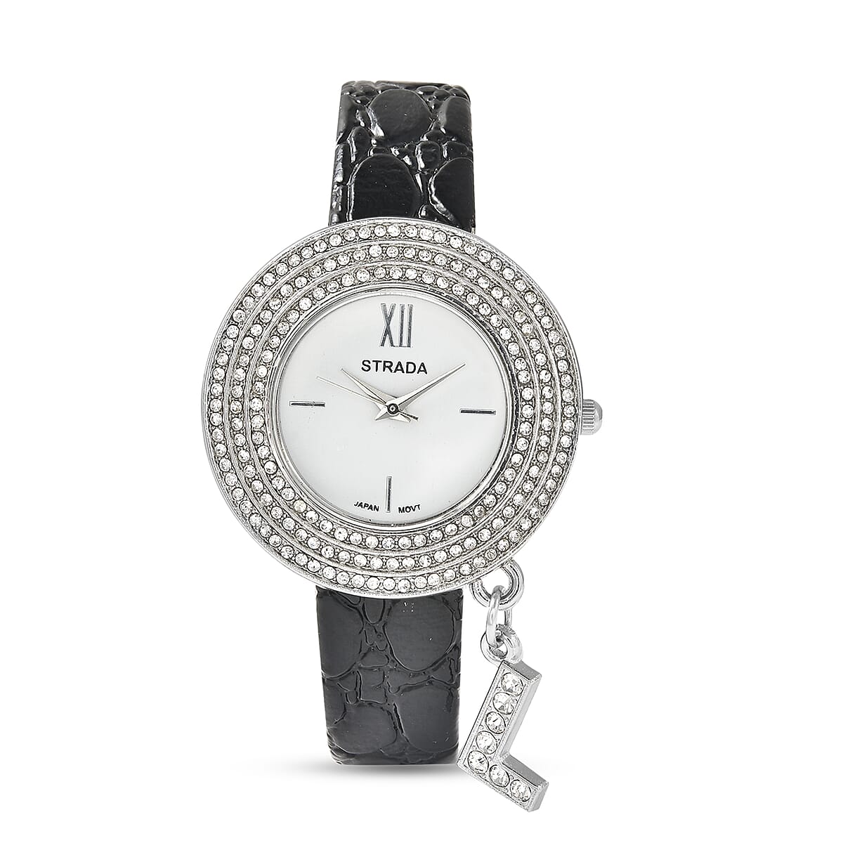 Strada Austrian Crystal Japanese Movement Triple Halo Watch with Initial L Charm and Black Faux Leather Strap , Women's Designer Watch , Analog Luxury Wristwatch