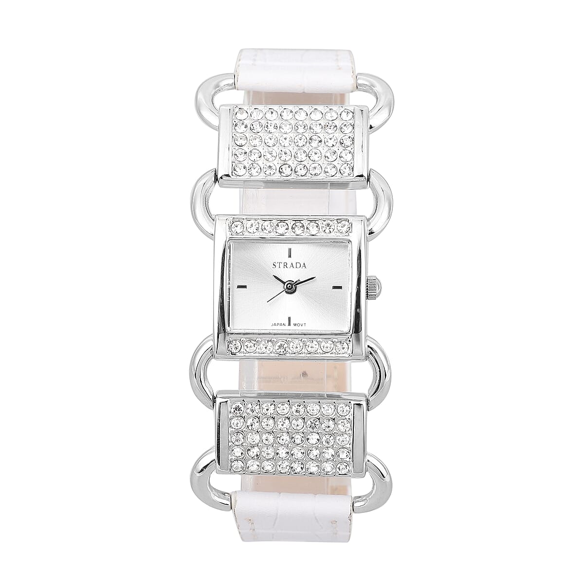 Strada Austrian Crystal Japanese Movement Watch with White Faux Leather Band