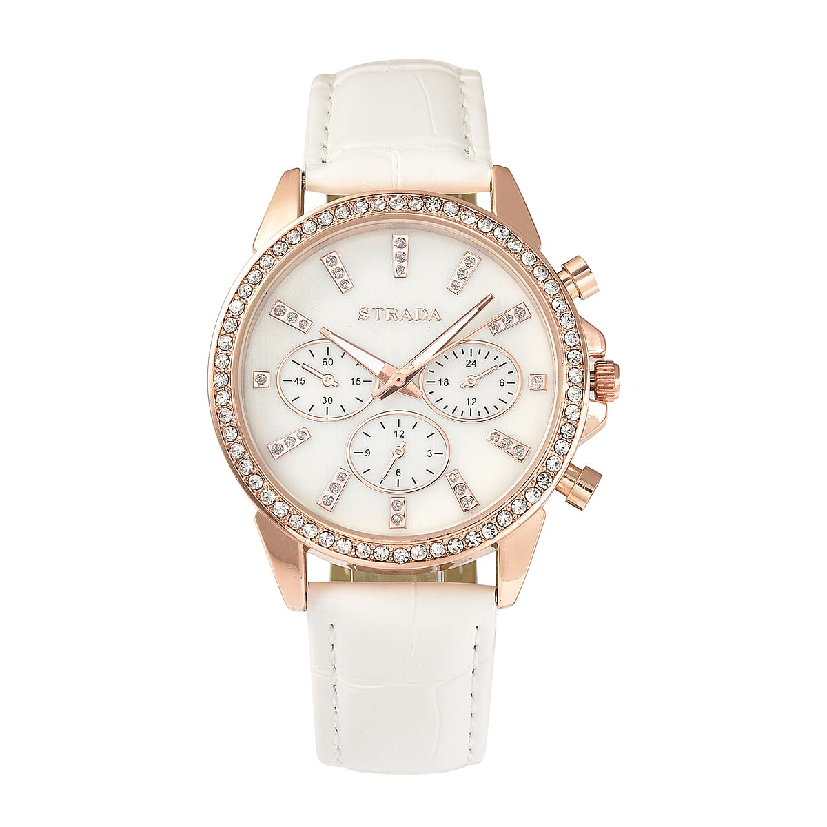 Strada Austrian Crystal Japanese Movement Watch with White Faux Leather Strap