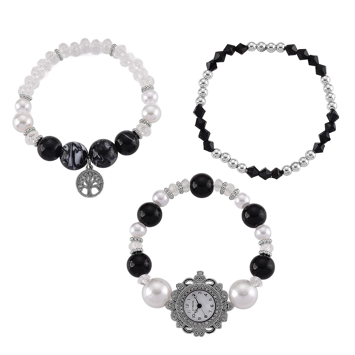 Strada Black Glass SL68 Quartz Movement Watch and 2pcs Silvertone Bracelet (7-7.5In)