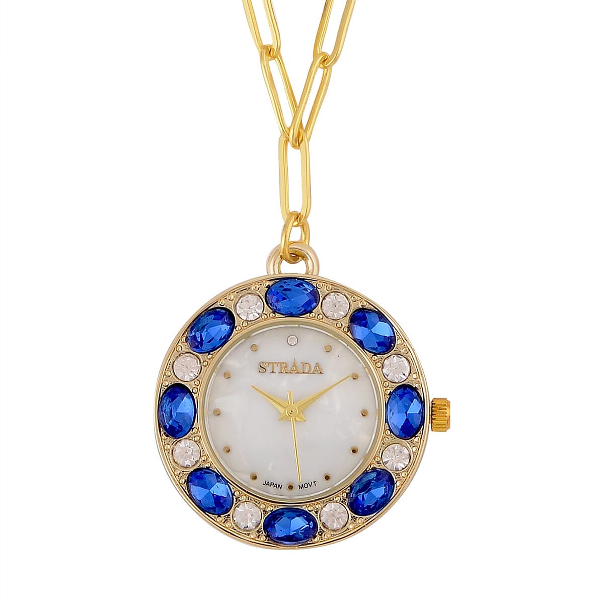 Strada Blue and White Austrian Crystal Japanese Movement Pocket or Pendant Watch in Goldtone with Paper Clip ION Plated YG Stainless Steel Chain (31.75 mm) (18- 30 Inches)