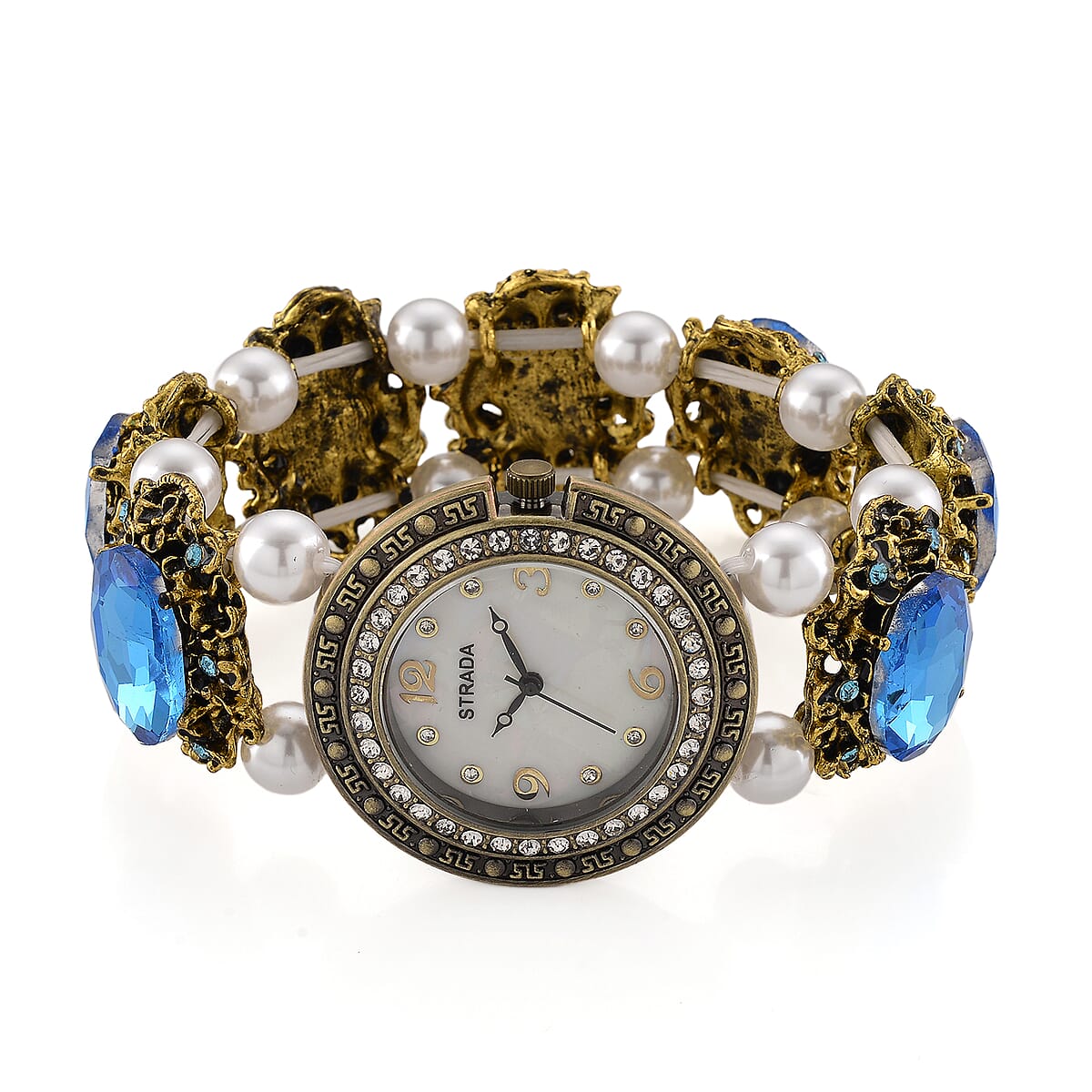 Strada Blue Glass and White Resin Pearl SL68 Quartz Movement Stretch Bracelet Watch in Goldtone