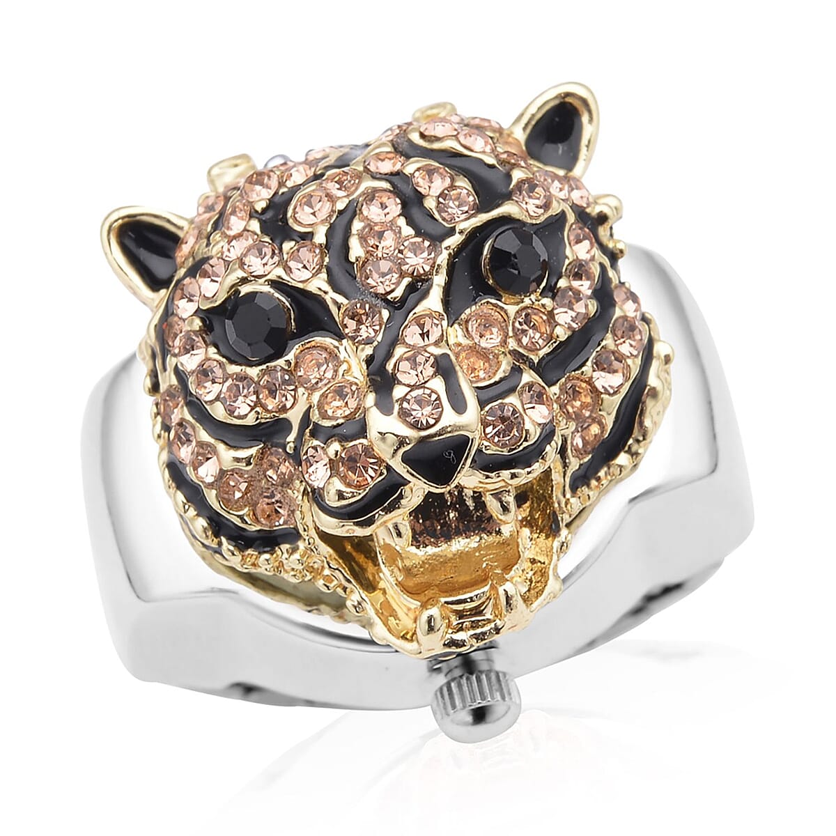 Strada Champagne and Black Austrian Crystal, Enameled Japanese Movement Tiger Head Pattern Ring Watch in Stainless Steel (5.0-7.0In)