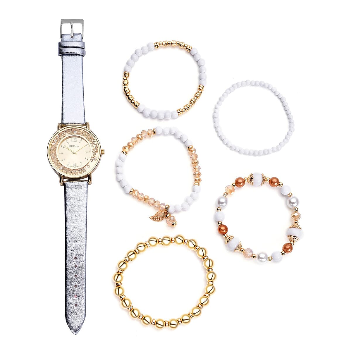 Strada Champagne Crystal Japanese Movement Watch with Silver Faux Leather Strap (40mm) (5.25-7In) and Set of 5 White with Multi Beaded Stretch Bracelet