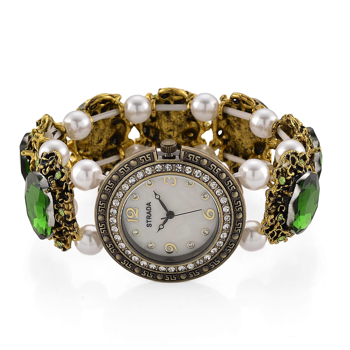 Strada Green Glass and White Resin Pearl SL68 Quartz Movement Stretch Bracelet Watch in Goldtone