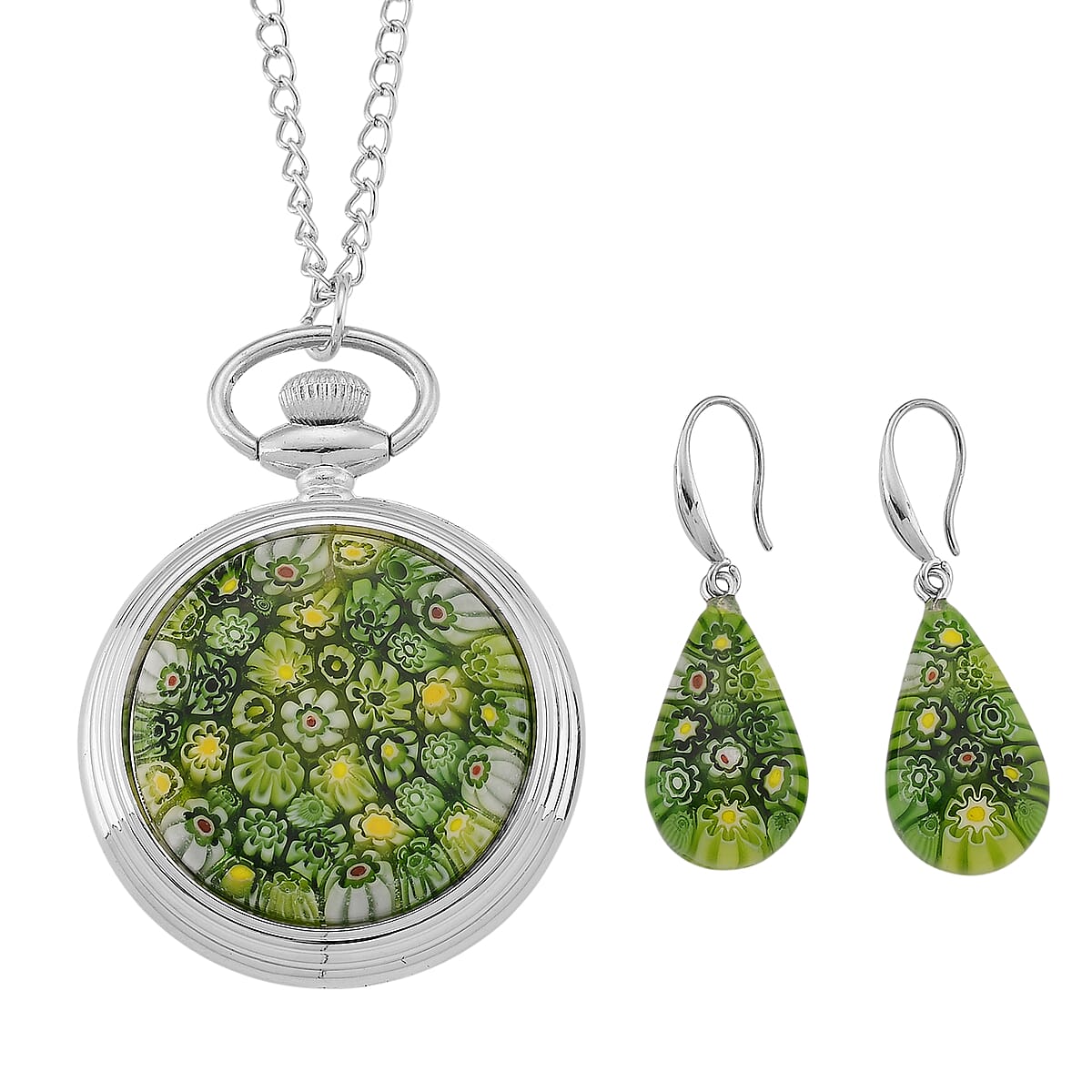 Strada Green Murano Style Japanese Movement Pocket Watch in Silvertone and Stainless Steel Earrings