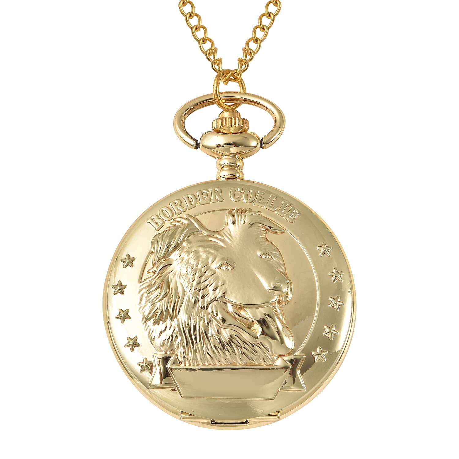 STRADA Japanese Movement Border Collie Pattern Pocket Watch with Goldtone Chain 31 Inches