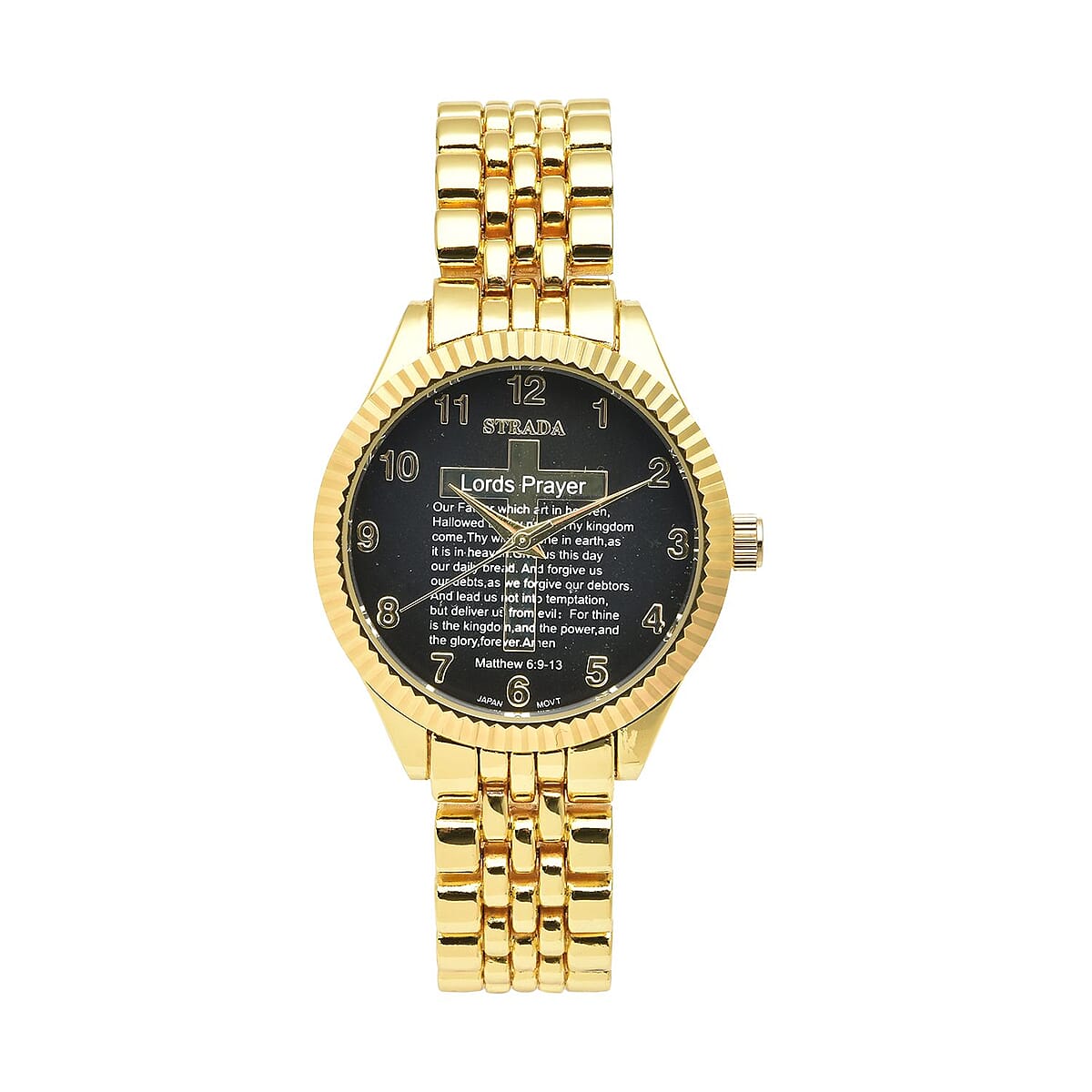 Strada Japanese Movement Cross Lords Prayer Pattern Dial Watch in Goldtone Strap (36mm) (7.50-8.25Inches)