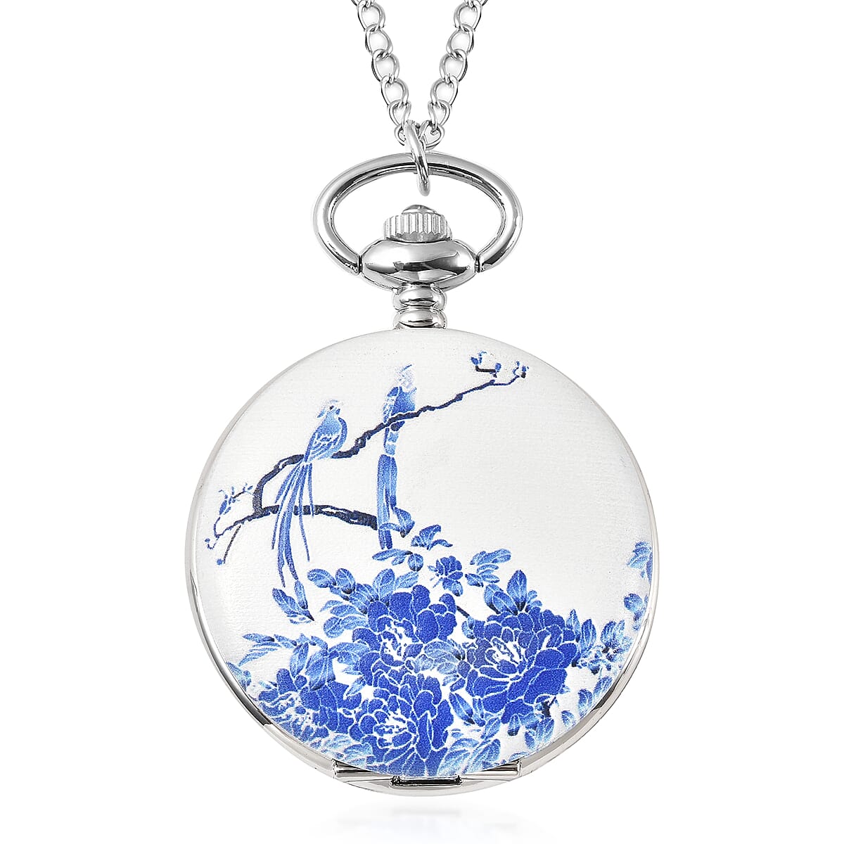 STRADA Japanese Movement Floral Pattern Pocket Watch with Chain (31 Inches) in Silvertone