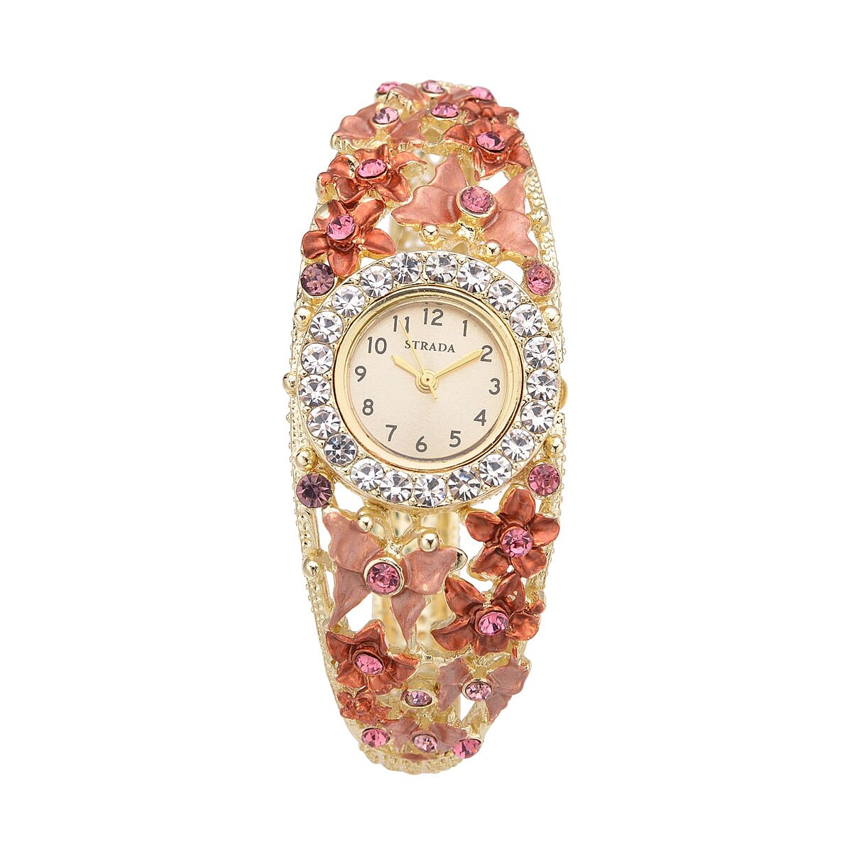 Strada Japanese Movement Fuchsia and White Crystal Floral & Butterfly Pattern Bangle Bracelet (6.5-7 In) Watch in Goldtone (24.65mm)