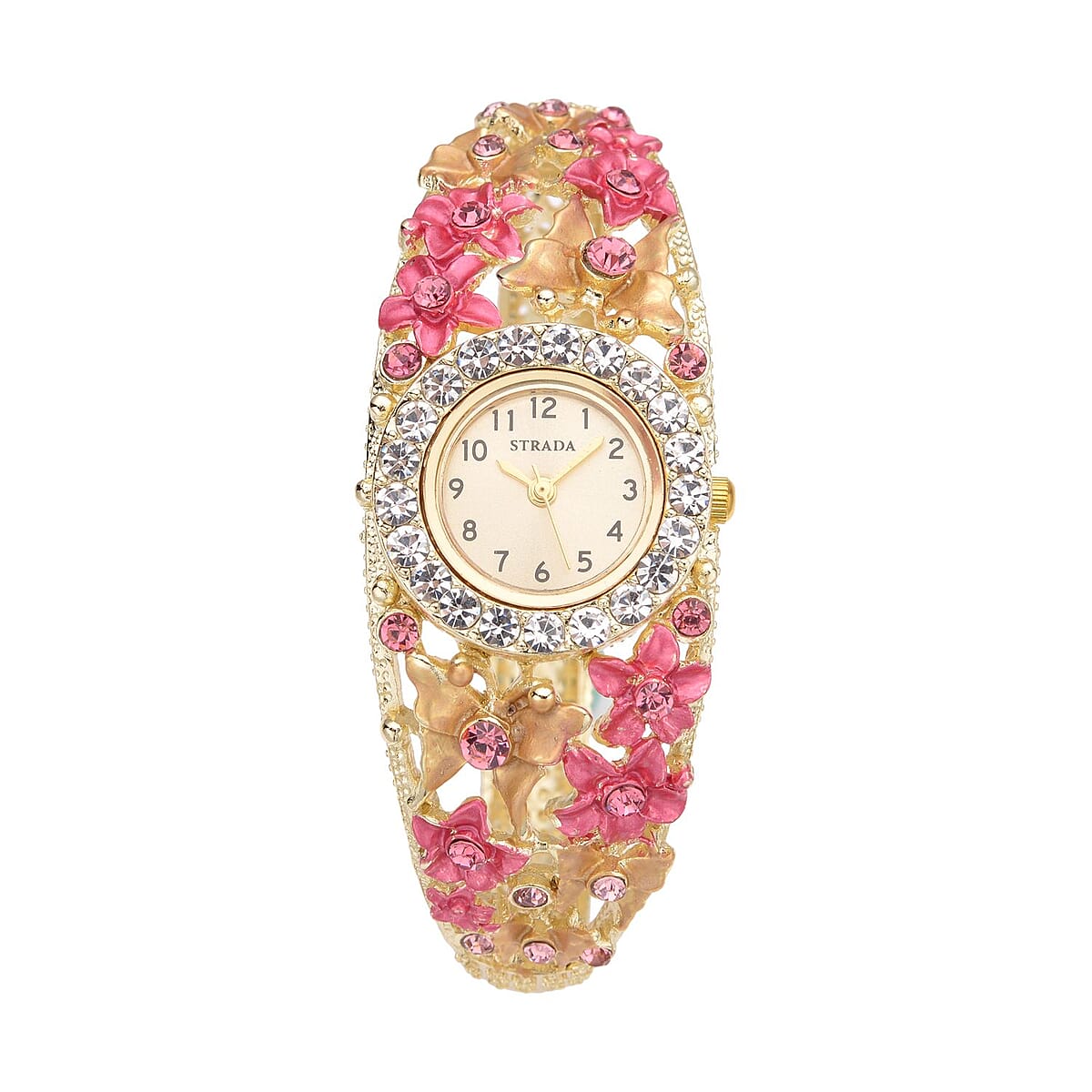 Strada Japanese Movement Pink and White Crystal Floral & Butterfly Pattern Bangle Bracelet (6.5-7 In) Watch in Goldtone (24.65mm)