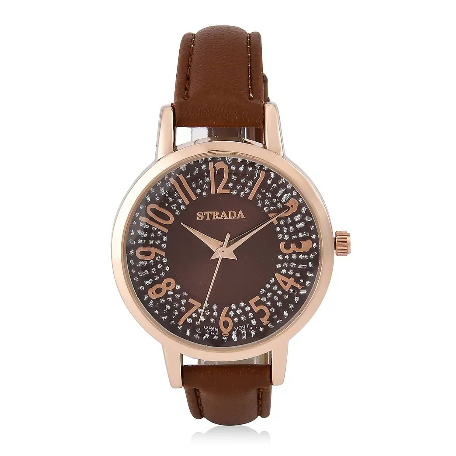 This Strada Japanese movement watch features a reliable Japanese mechanism encased in a sleek design with a faux leather strap. This combination provides both durability and comfort for everyday wear. Its elegant dial and stylish strap make it a versatile choice that pairs well with both casual and formal attire.
