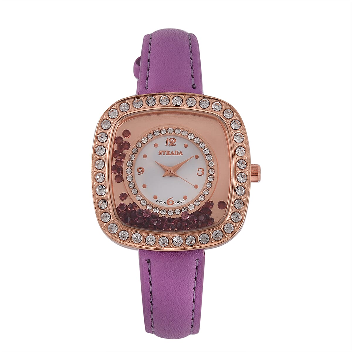 Strada Moving Purple and White Austrian Crystal Japanese Movement Watch with Purple Faux Leather