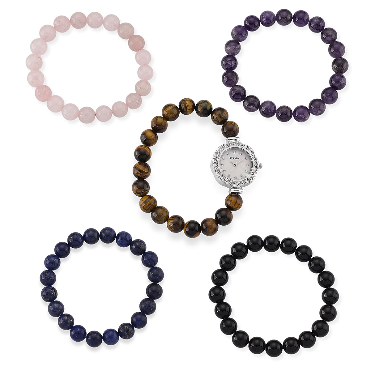 Accessorize beautifully with the Strada multi-gemstone bracelet watch and beaded bracelets. This stunning multi-gemstone bracelet watch combines functionality with fashionable flair. The Japanese movement ensures reliable timekeeping for everyday wear. It expresses your personal style while inviting admiring glances.