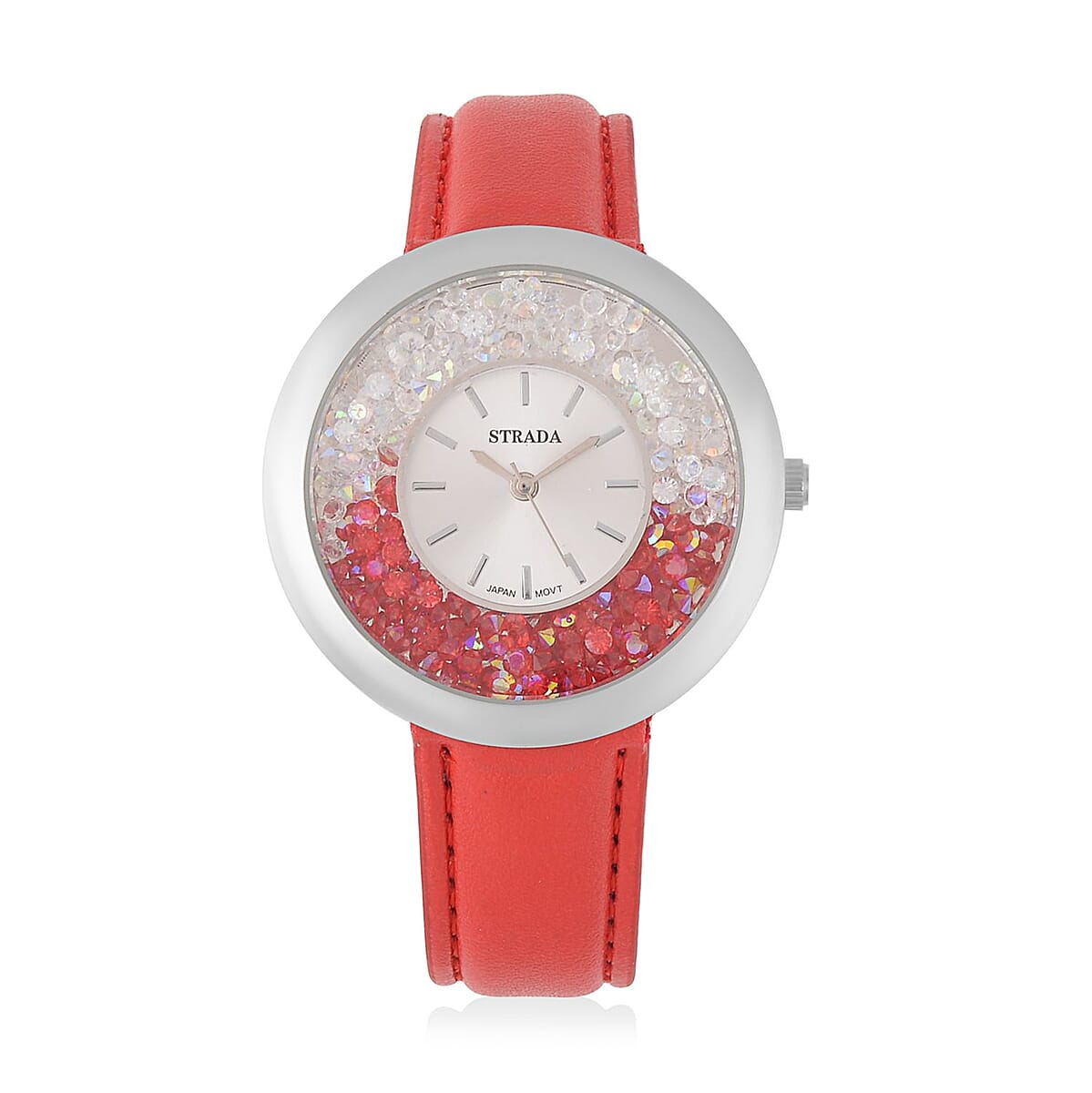 Strada Red and Aurora Borealis Austrian Crystal Japanese Movement Water Resistant Watch with Red Faux Leather Band and Stainless Steel Back (40mm) (6.75-8.5In)