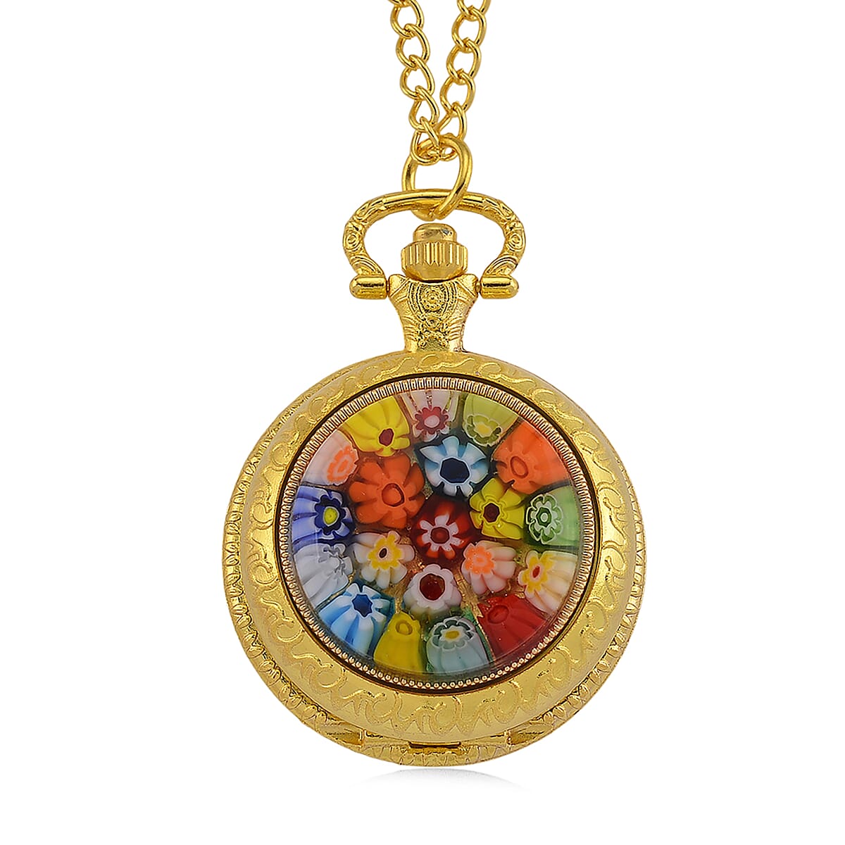 Strada Rotating Multi Murano Style Japanese Movement Pocket Watch with Chain (36 Inches) in Goldtone