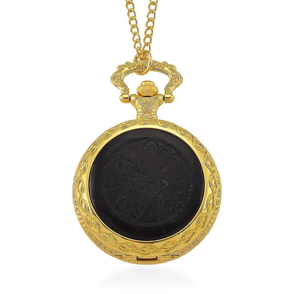 Strada Shungite Japanese Movement Peacock Pocket Watch with Chain (36 Inches) in Goldtone 2.00 ctw