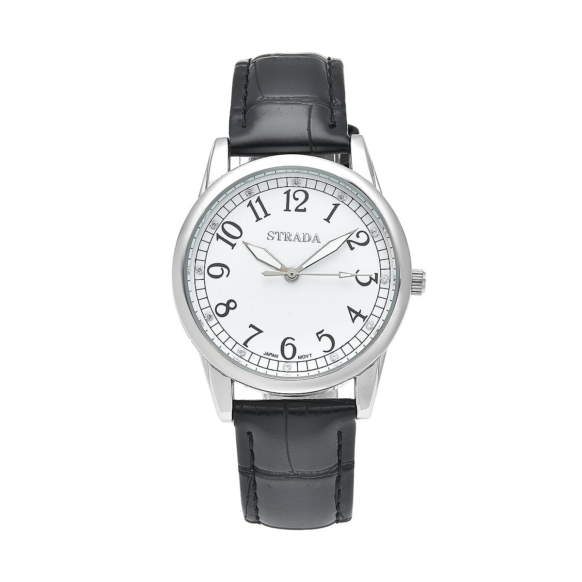 The Strada simulated diamond watch with faux leather strap features a Japanese movement for reliable precision and is adorned with simulated diamonds for an opulent look. It includes a faux leather strap that combines durability with comfort. This analog watch offers style and functionality, making it a practical choice for everyday wear.