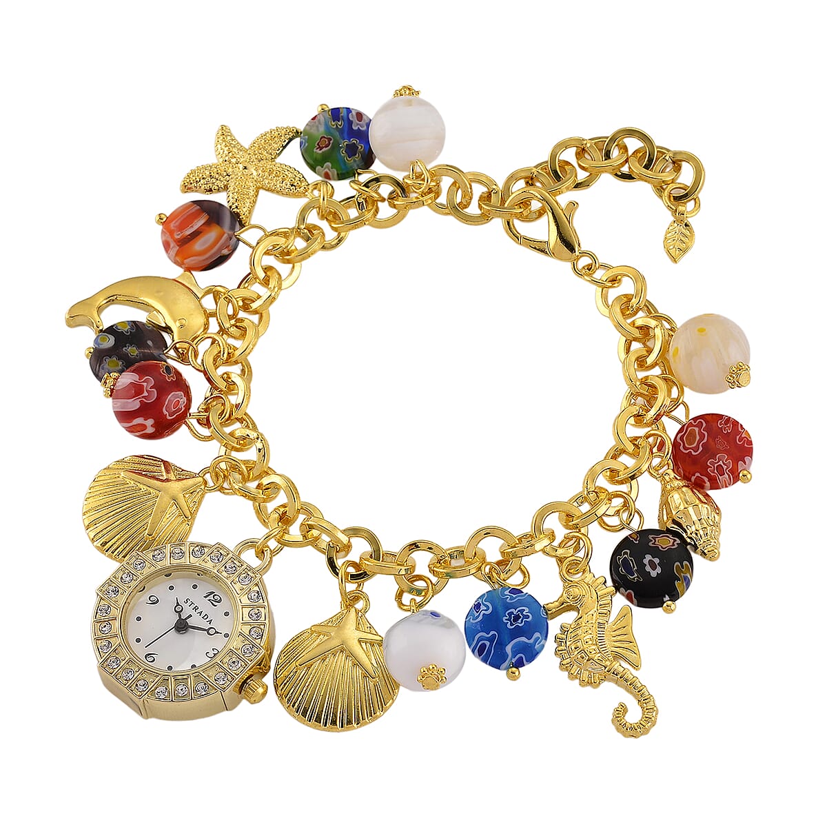 Strada SL68 Quartz Movement Stretch Bracelet Watch Murano Style Beads and Charms in Goldtone