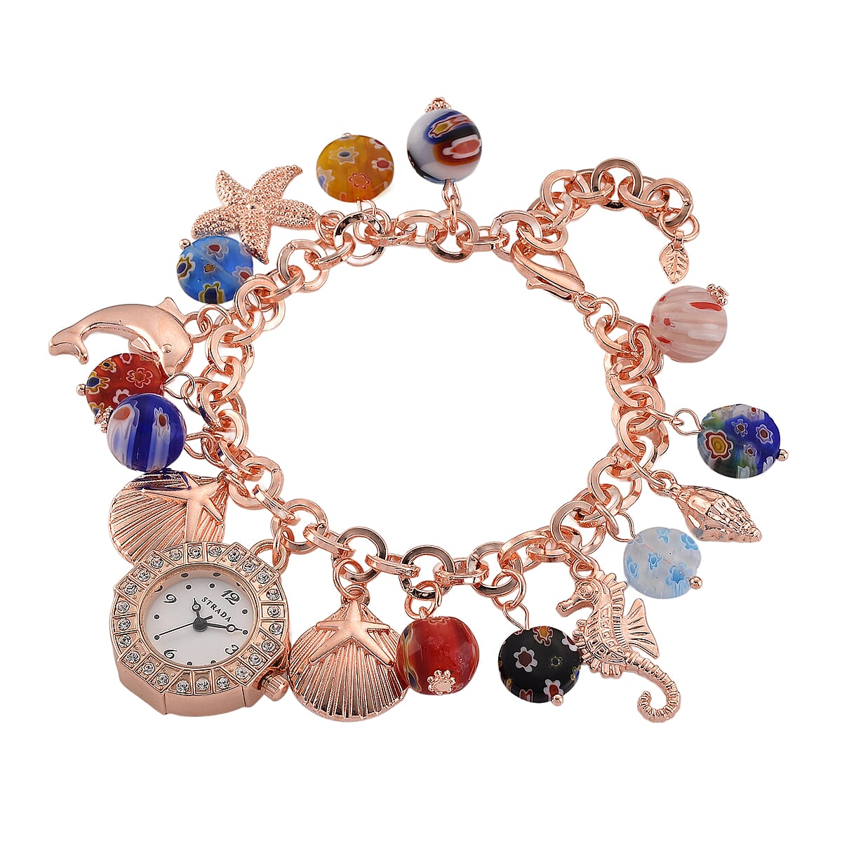 Strada SL68 Quartz Movement Stretch Bracelet Watch Murano Style Beads and Charms in Rosetone