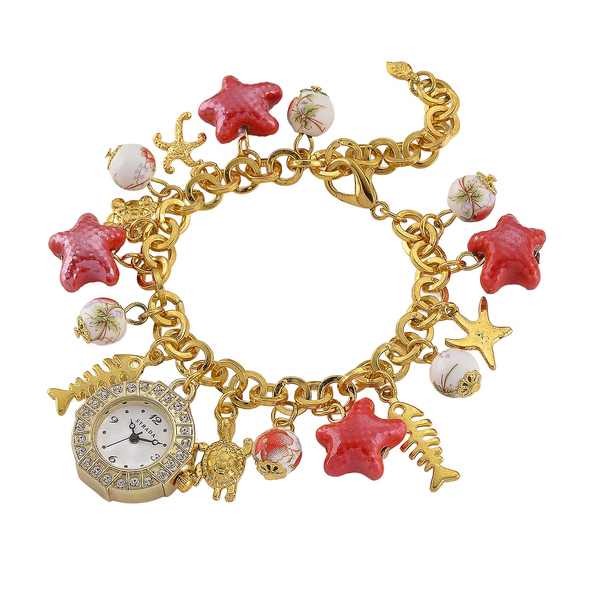 Strada SL68 Quartz Movement Stretch Bracelet Watch Red Ceramic Beads and Star, Charms in Goldtone