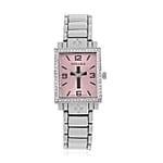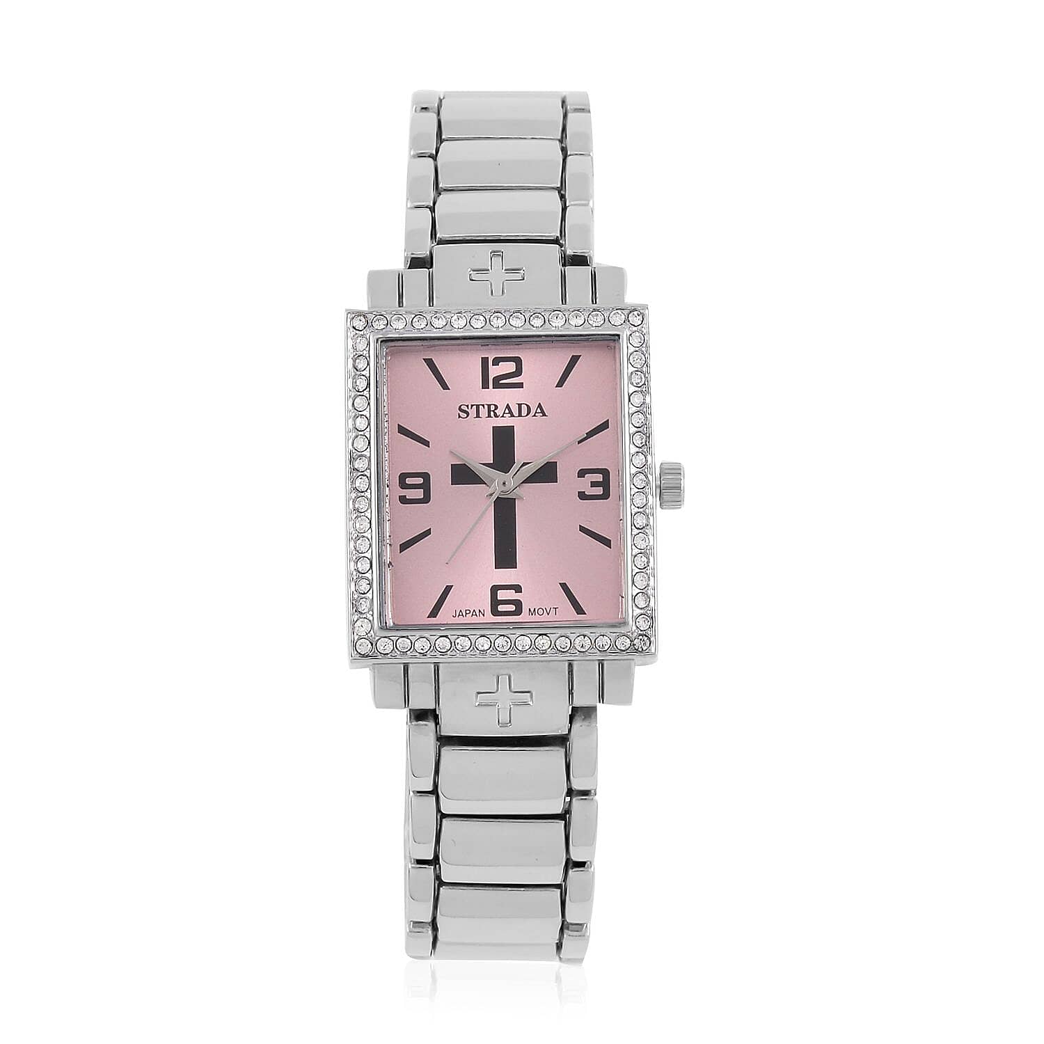 Strada White Austrian Crystal Japanese Movement Cross Pattern & Pink Dial Watch with Silvertone Strap (26.16-30.48 mm) (6.75-8.25 Inches)