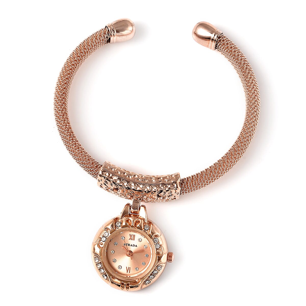 Strada White Austrian Crystal Japanese Movement Dangling Dial Cuff Bangle Watch in Rosetone (6.50 In)