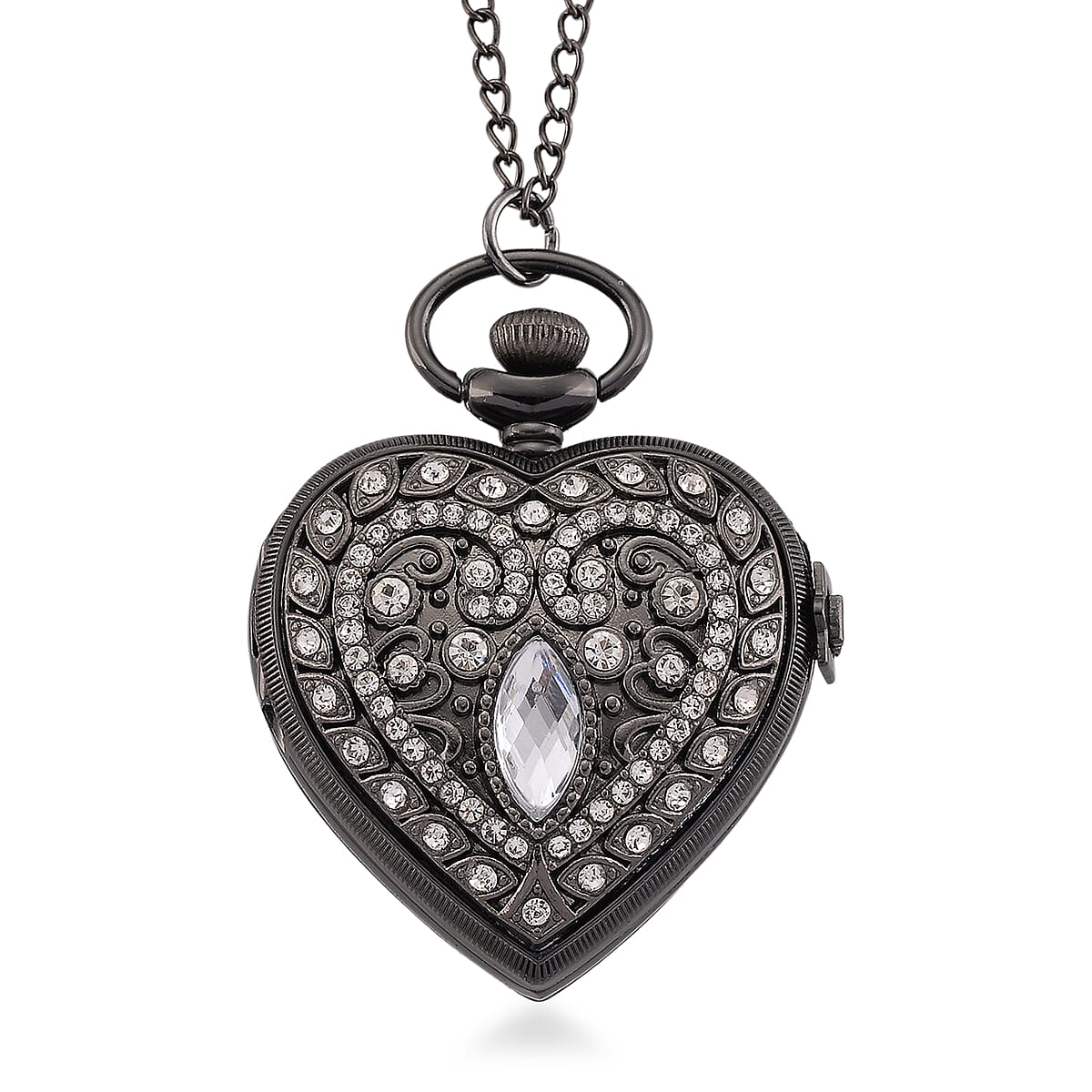 Strada White Glass, Multi Color Austrian Crystal Japanese Movement Heart Shaped Pocket Watch with Chain (31 Inches) in Black Silvertone