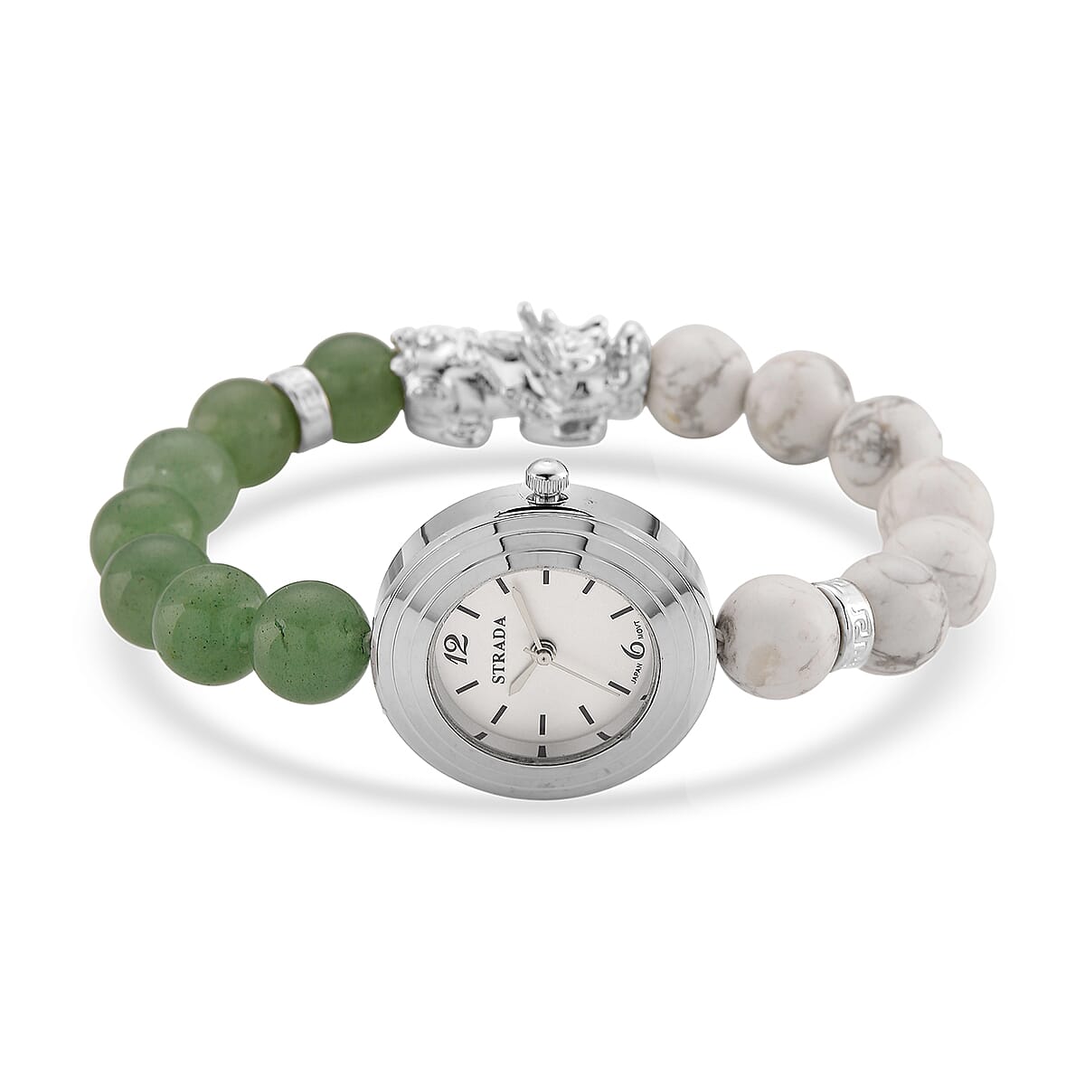 Strada White Howlite and Green Aventurine Japanese Movement Stretch Bracelet Watch with Pixiu Charm (7-7.5In) 30.00 ctw