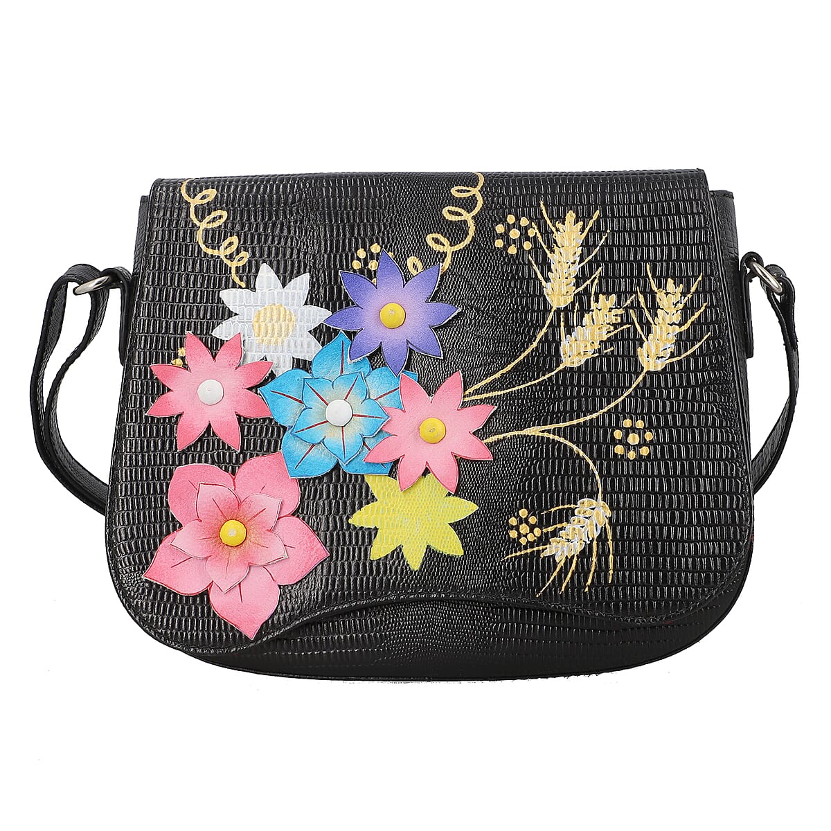 Sukriti Black Floral Pattern Genuine Leather Applique Crossbody Bag with Adjustable Shoulder Handle Strap