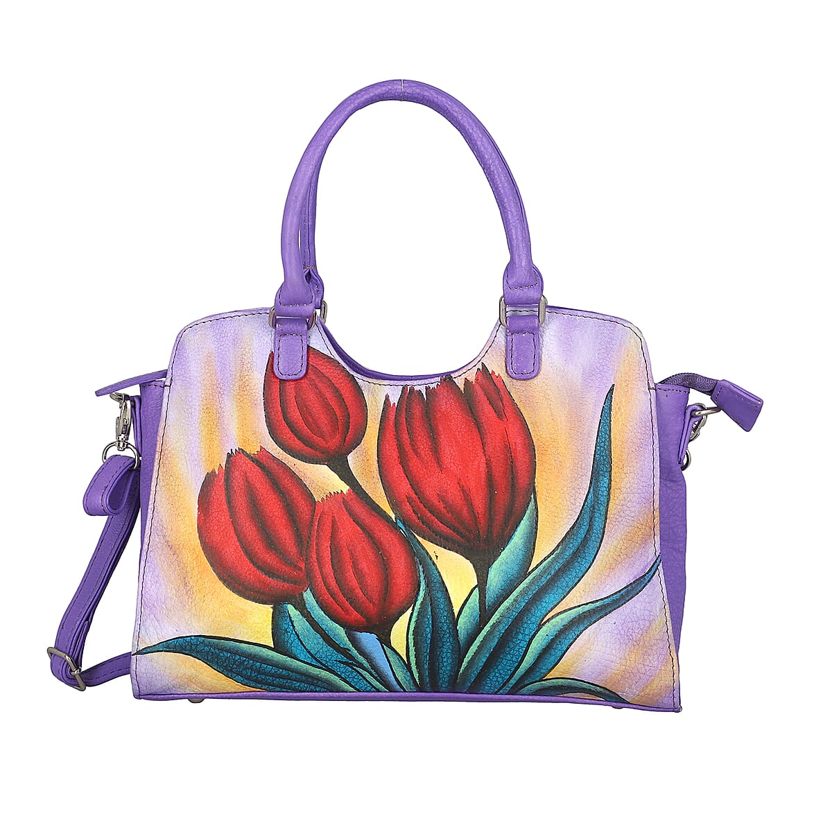 SUKRITI Light Purple Floral Hand Painted Genuine Leather Shoulder Tote Bag