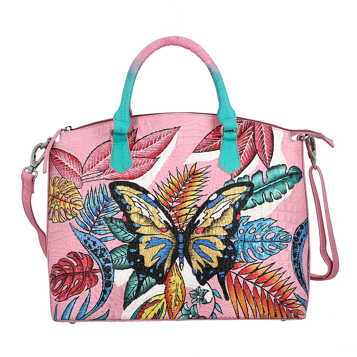 Sukriti Pink Butterfly Hand Painted Croco Embossed Genuine Leather Handbag With Adjustable Strap