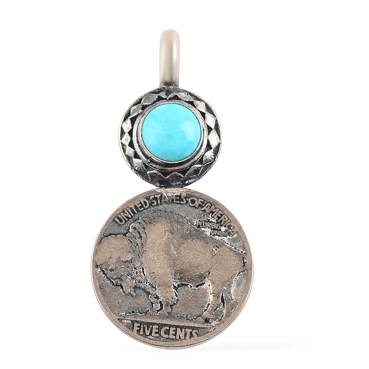 SUMMER DEALS Santa Fe Style Turquoise Buffalo Five Cents Coin Pendant in Sterling Silver 7.3 Grams 1.80 ctw