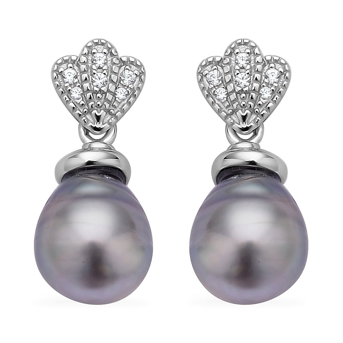 Tahitian Cultured Pearl 9-10mm and White Zircon Earrings in Rhodium Over Sterling Silver 0.20 ctw