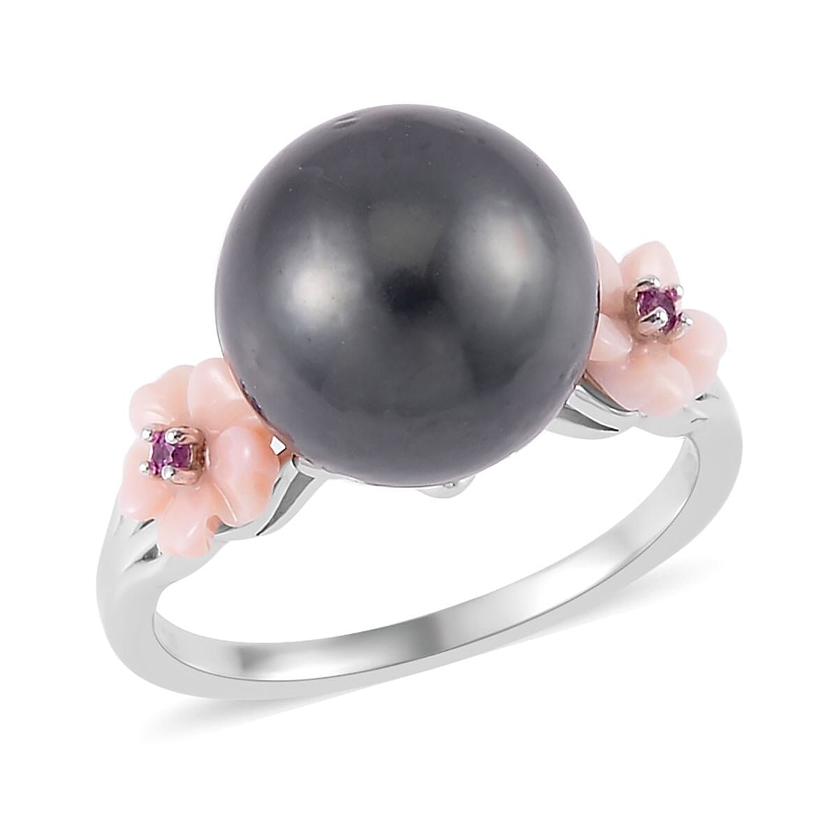 Immerse yourself in the allure of our Tahitian cultured pearl ring. The captivating round-shaped pearl takes center stage, highlighted by fancy-shaped multi gemstones that accentuate its natural beauty. Delicate flowers on either side enhance the floral design, while rhodium over sterling silver and a split shank complete the look with utmost grace.