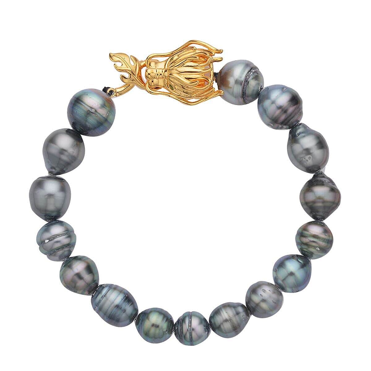 Indulge in the mystical beauty of this captivating bracelet, crafted from luxurious vermeil yellow gold over sterling silver. The focal point of this exquisite piece is the mesmerizing Tahitian cultured pearl, known for its unique colors and iridescent luster. The intricate craftsmanship and smooth metalwork create a dragon motif that adds mystery and allure to this stunning bracelet.