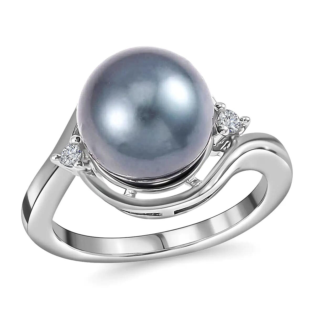 Tahitian Cultured Pearl Ring, White Zircon Accent Ring, Sterling Silver Ring, Pearl Jewelry 0.05 ctw