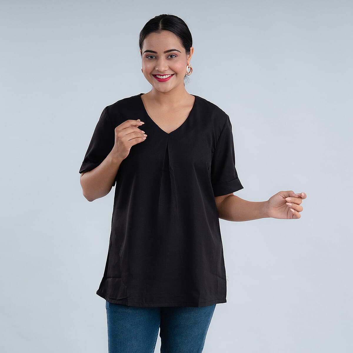 Tamsy Black 100% American Crepe V-neck Top - XL