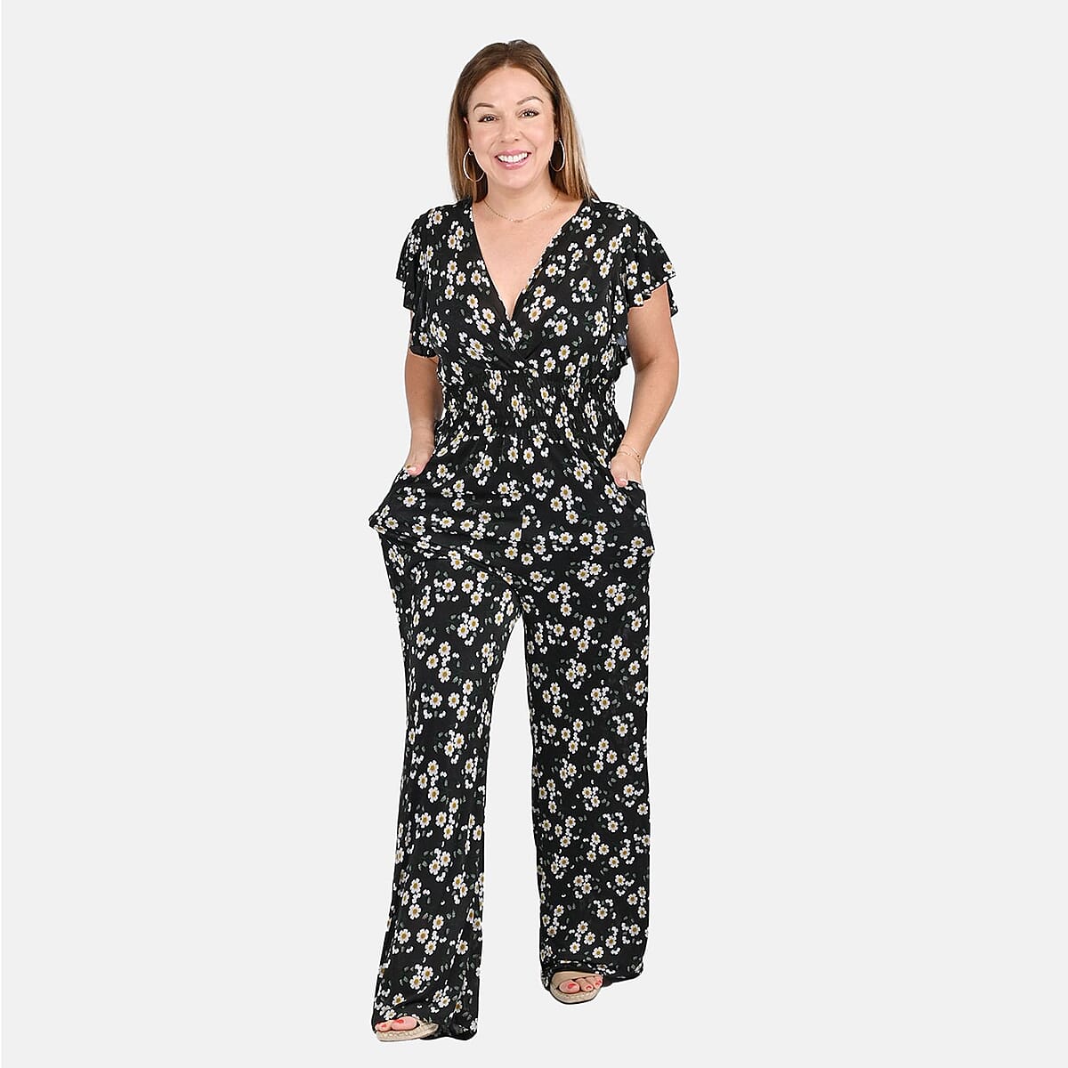Tamsy Black Daisy Pattern Smocked Waist Jumpsuit with Flutter Sleeve - One Size Fits Most