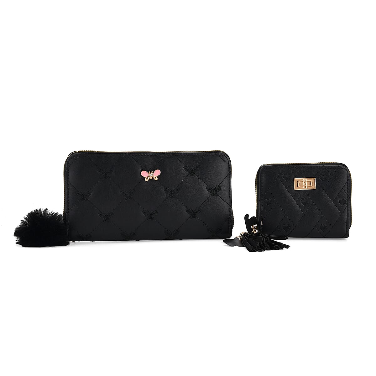 Tamsy Black Faux Leather Short Stitched Pattern Wallet and Long Wallet with Tassels
