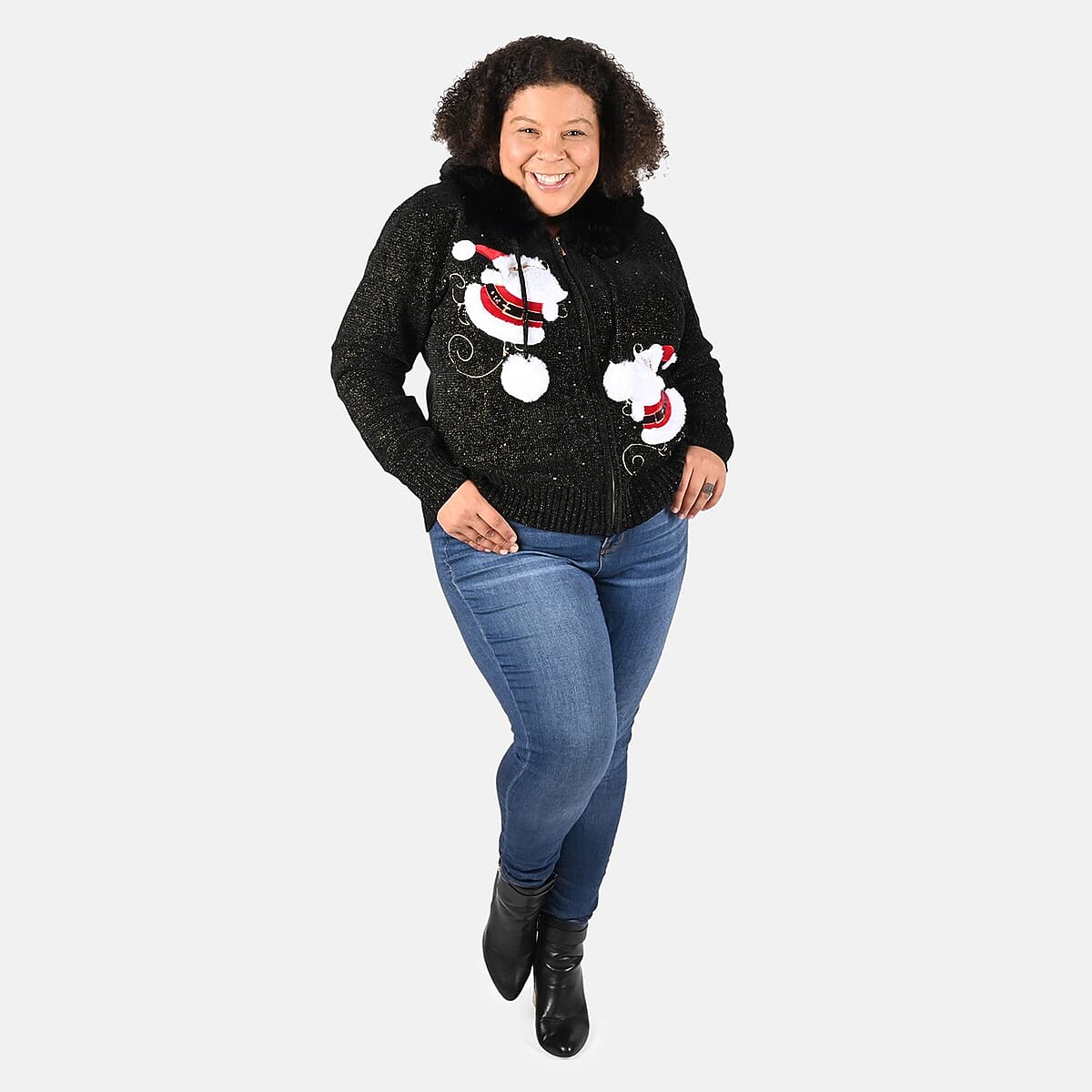 TAMSY Black Santa Christmas Sweater with Removable Fur Trim - S