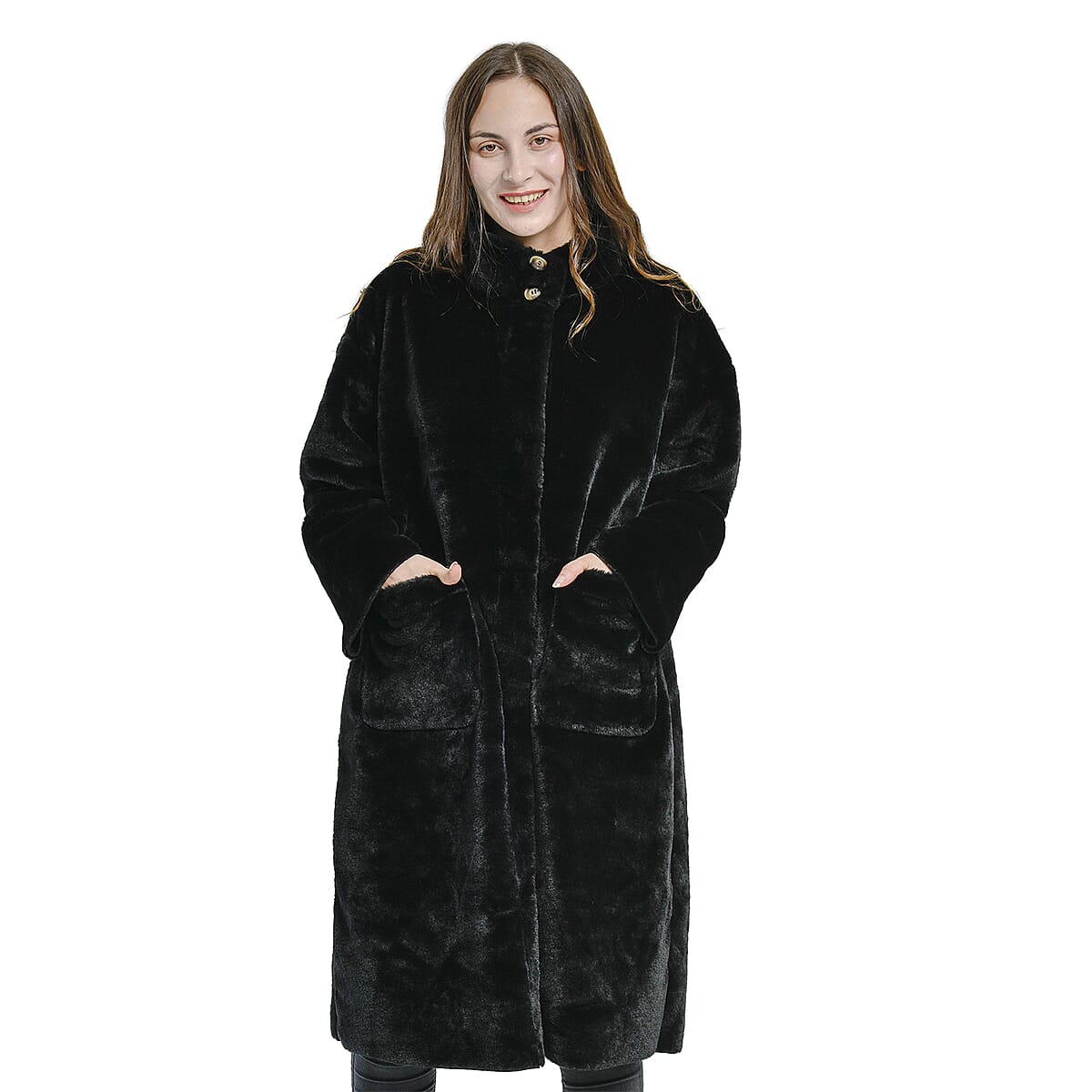 Tamsy Black Suede and Polyester Faux Fur Long Coat For Ladies, Ultra-Soft Quick Drying Machine Washable Womens Winter Coat- S