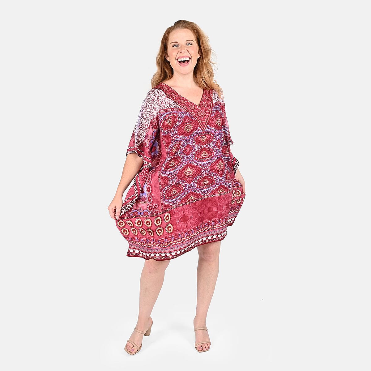 Tamsy Dark Pink Floral Screen Printed Short Kaftan - One Size Fits Most