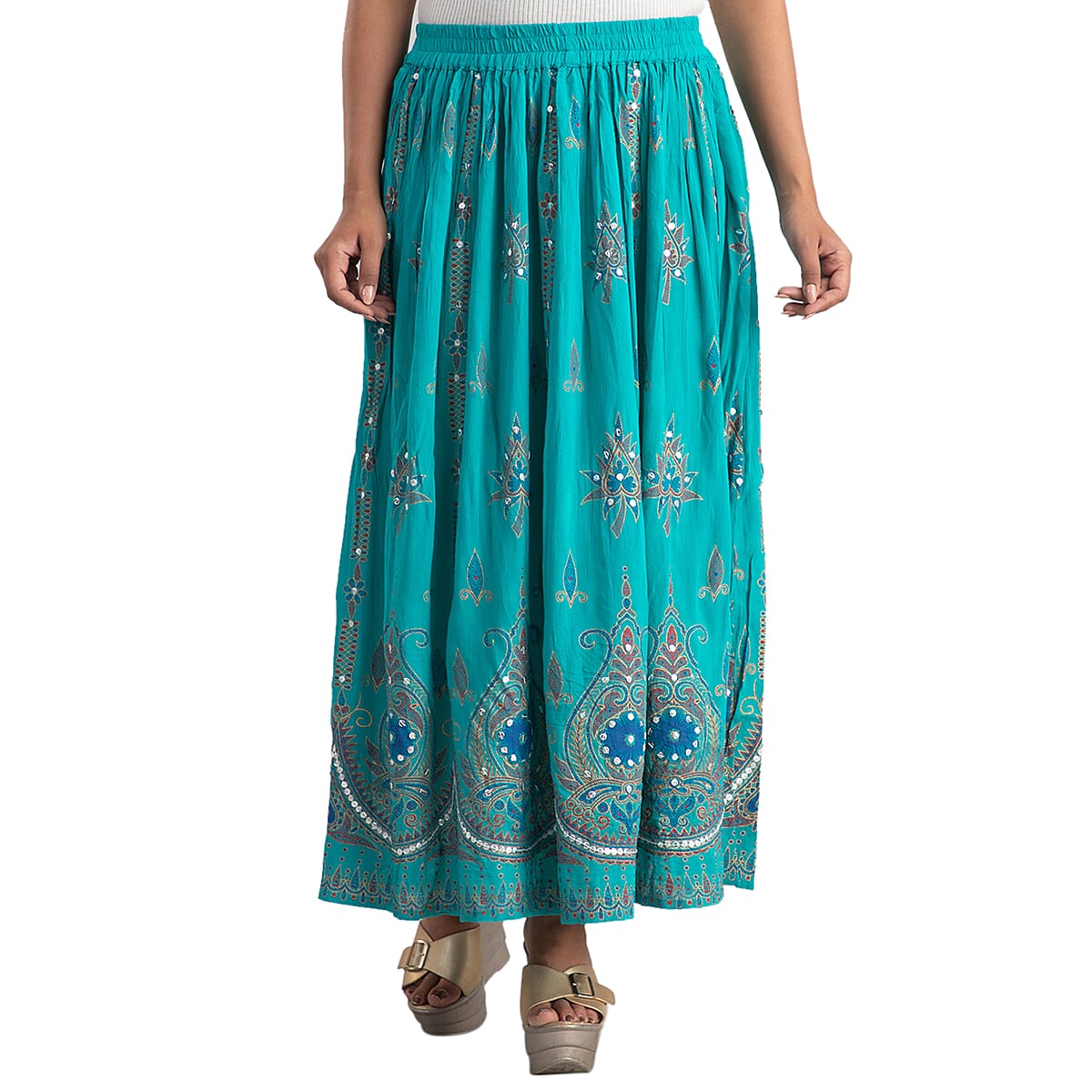 Tamsy Green Sequin Embellished Long Skirt for Women , Cotton Skirt , Summer Skirts , Women Skirt