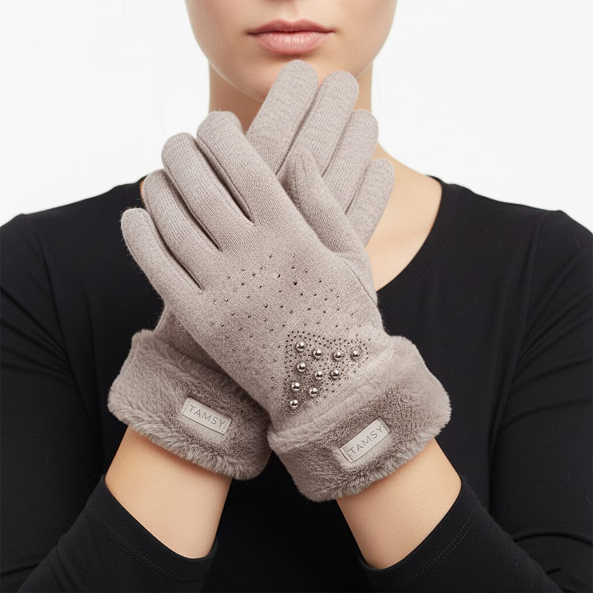 Wrap your hands in Tamsy cashmere wool gloves for instant warmth and comfort. These touchscreen gloves combine luxury with practical functionality. They feature pearl studding for sophisticated winter style. Their cashmere wool blend delivers exceptional softness against your skin.