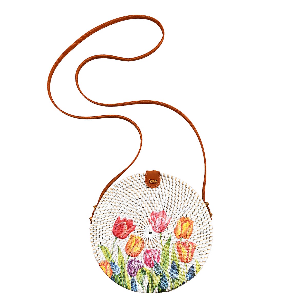 Tamsy Handmade White Round Shape Rattan Crossbody Bag with Floral Printed Motif