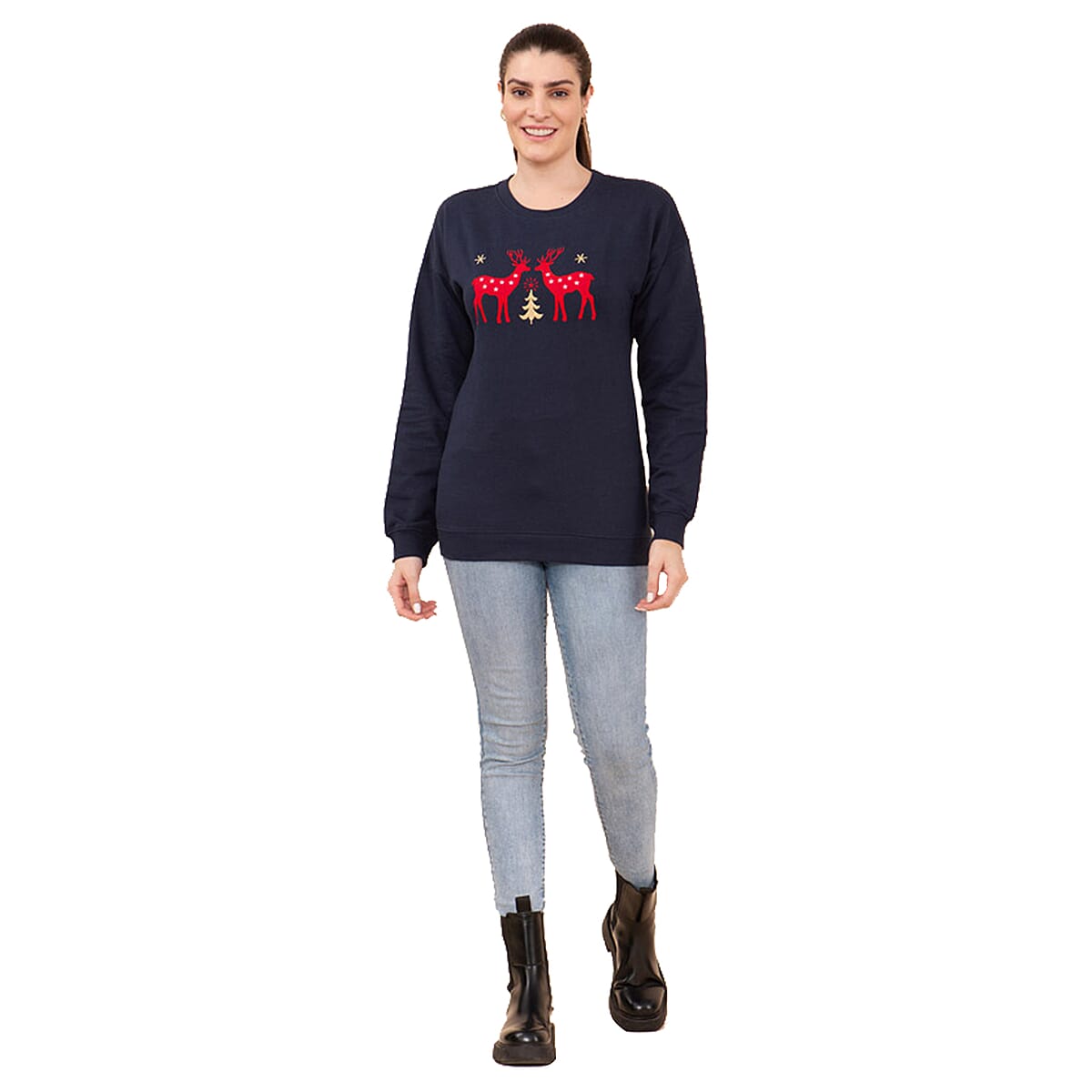 Tamsy Holiday Navy Reindeer Fleece Knit Sweatshirt For Women (100% Cotton) - 1X