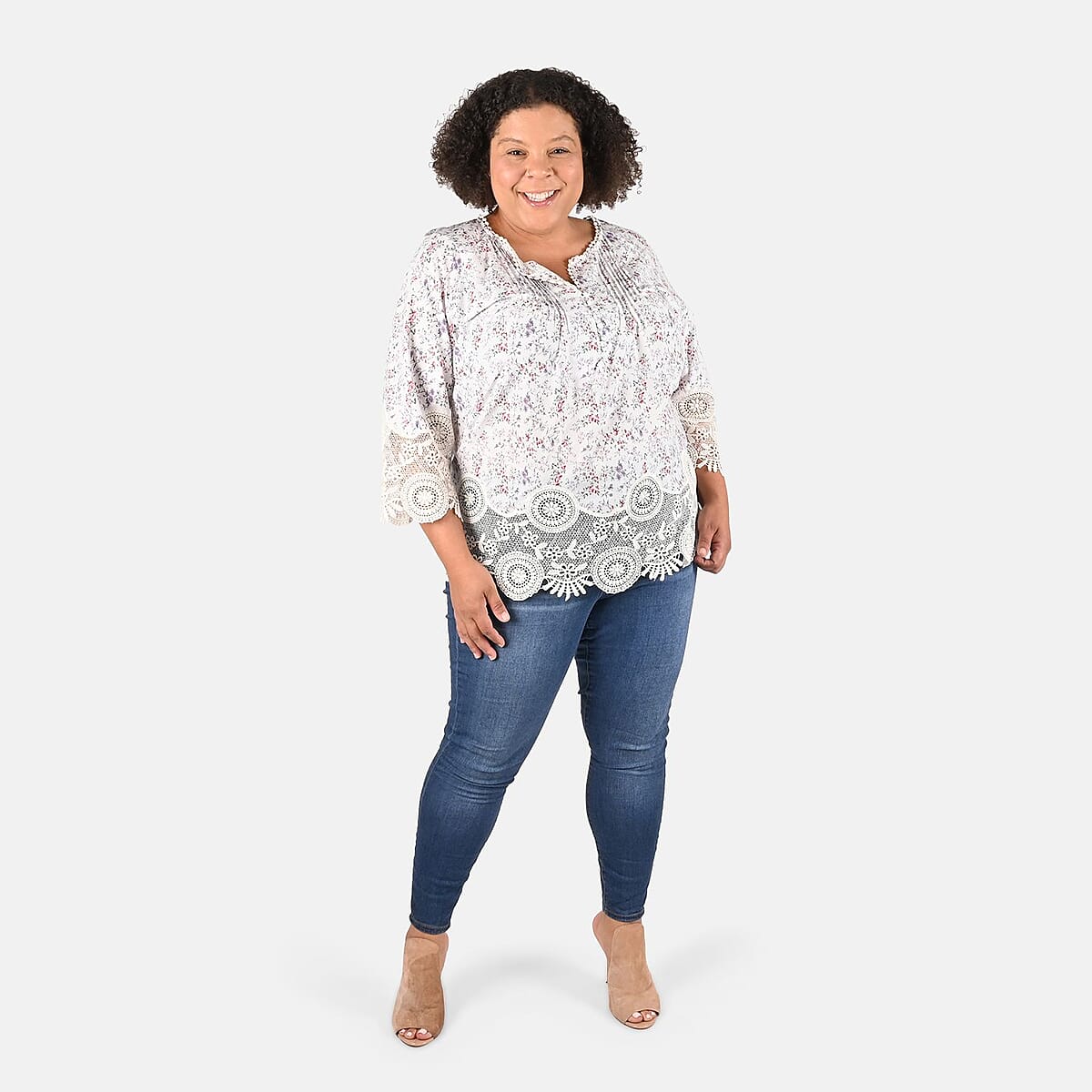 Tamsy Ivory Floral Vivian Vintage Tunic with Lace Trim - 1X