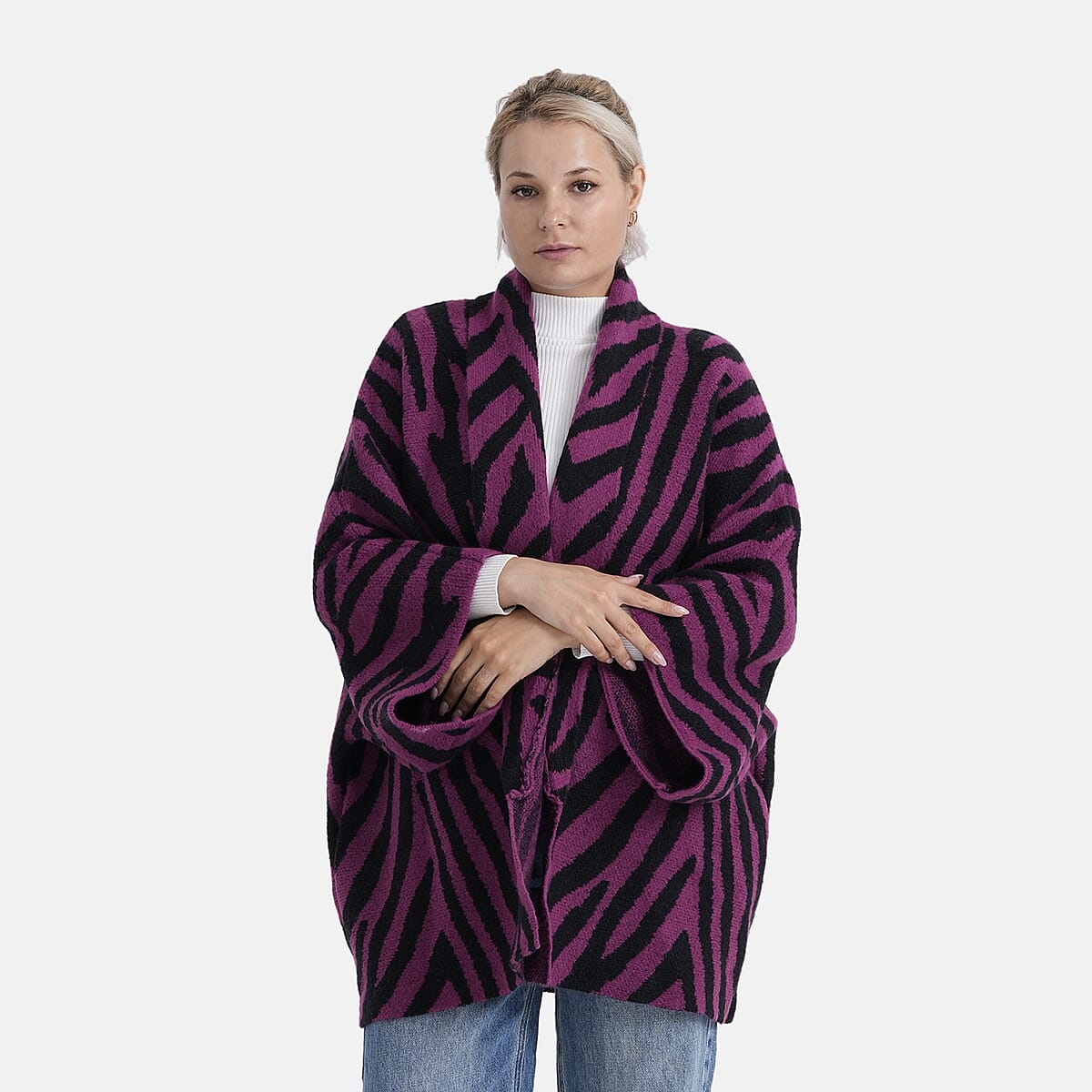 TAMSY Magenta Zebra Double Knit Jacquard Cardigan with Shawl Collar - One Size Fits Most